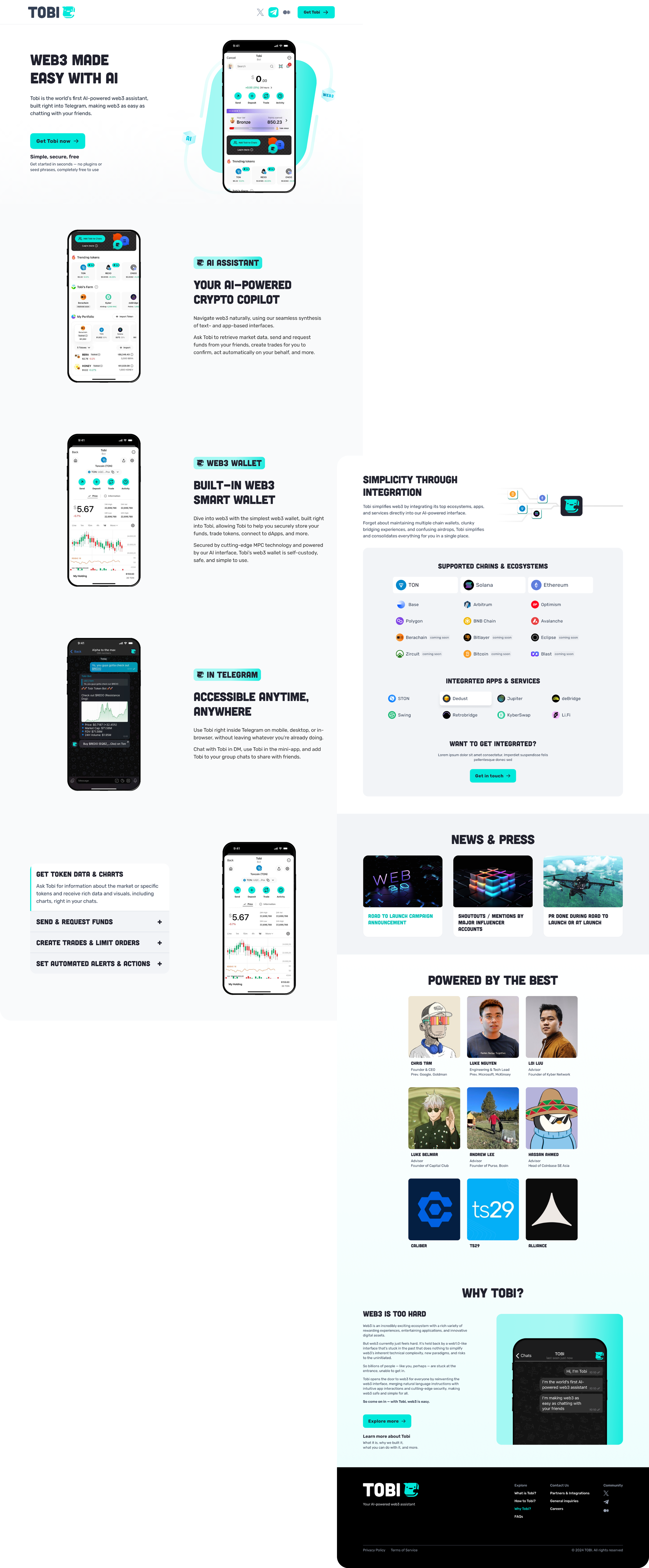 Tobi là trợ lý Web3 AI được tích hợp trực tiếp vào Telegram, giúp người dùng quản lý ví tiền điện tử và thực hiện các giao dịch một cách dễ dàng như khi trò chuyện với bạn bè.